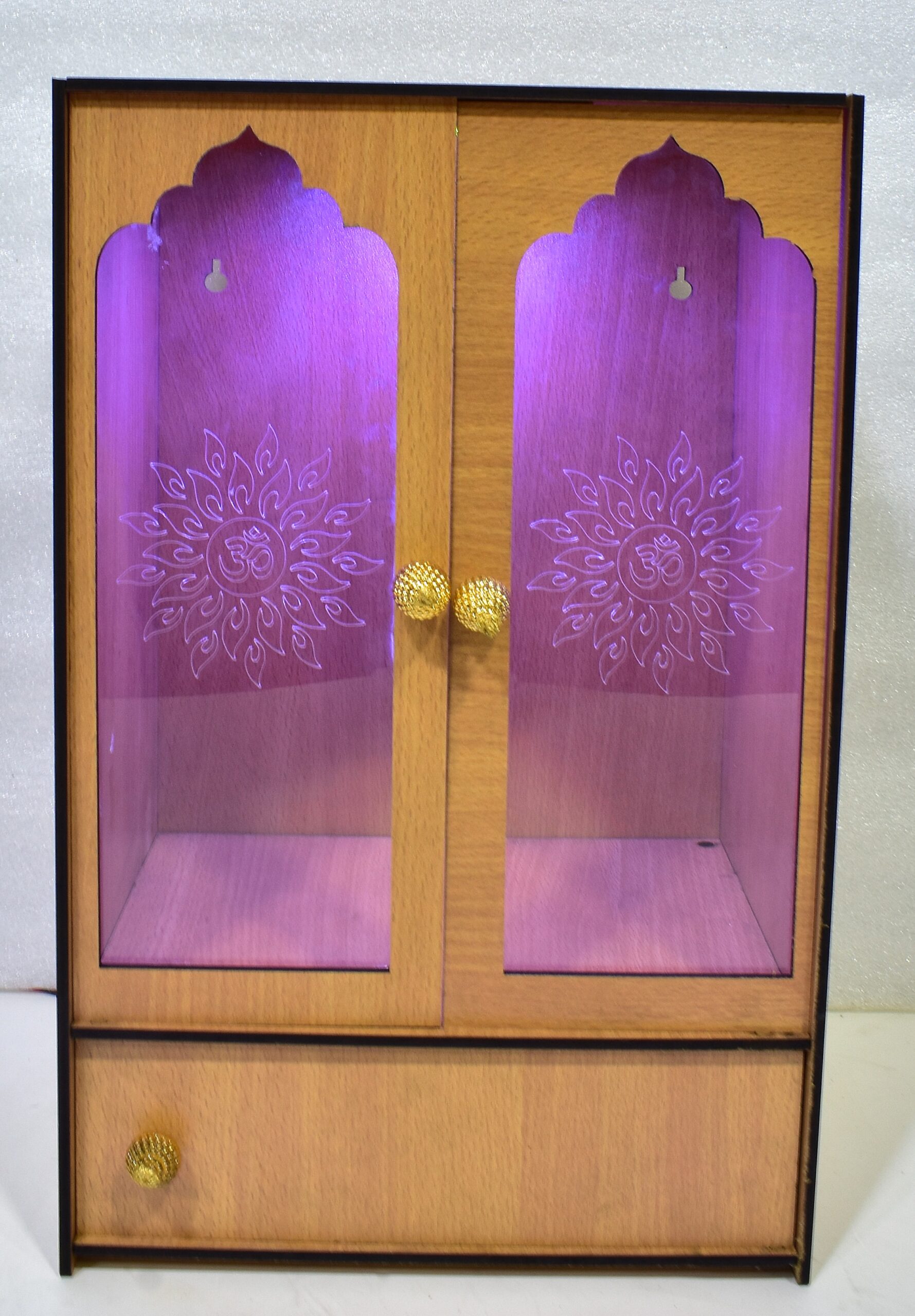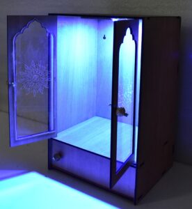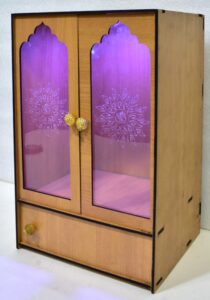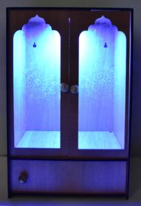 → “Elegant Wooden Laser-Cut Pooja Mandir with LED Lights & Drawer – Perfect for Home & Office Decor” (H-16, L-9, W-12 Inch)