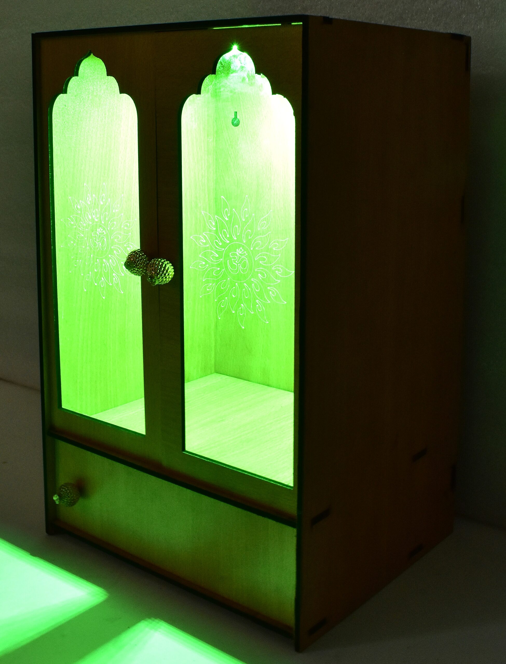 “Elegant Wooden Laser-Cut Pooja Mandir with LED Lights & Drawer – Perfect for Home & Office Decor” (H-16, L-9, W-12 Inch)