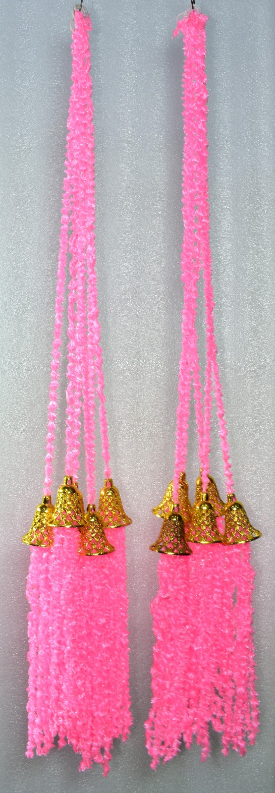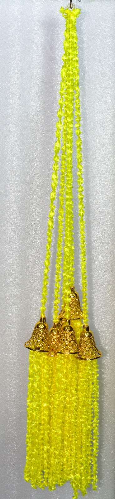 Bright fabrics in shades of red, yellow, green, and pink are used to create beautiful hanging decorations on ceilings or walls.